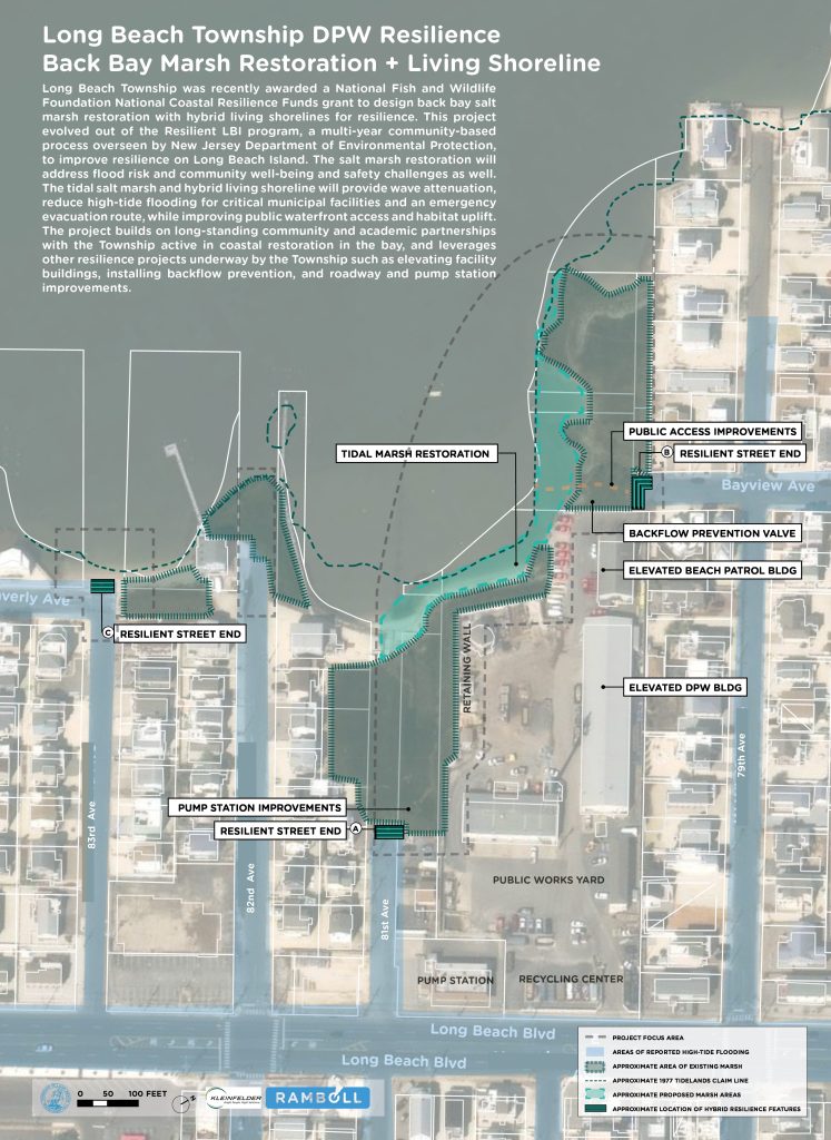 Long Beach Township is currently exploring opportunities for flood reduction and resilient, ecological shorelines. This project evolved out of the Resilient LBI Action Plan and is funded by a grant from the National Fish and Wildlife Foundation. The Township is working with a team of research and design partners to study and design a project that enhances back bay habitat while reducing high tide flooding on Long Beach Boulevard which will reduce the frequency of disruptions to the Long Beach Township Department of Public Works (DPW) critical facility.