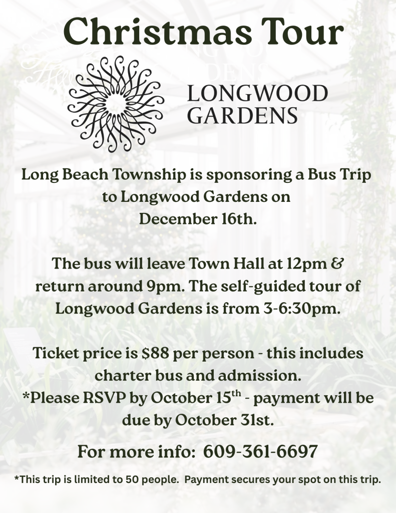 Long Beach Township is sponsoring a bus trip to Longwood Gardens on December 16th. The bus will leave Town Hall at 12pm and return around 9pm. The self-guided tour of Longwood Gardens is from 3pm-6:30pm.