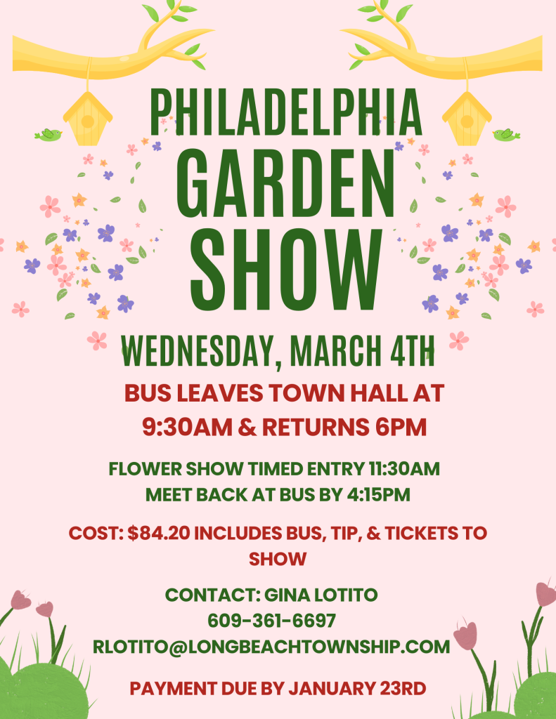 Long Beach Township is sponsoring a trip to the Philadelphia Flower Show on March 4th. The bus will leave Town Hall at 9:30am and return around 6pm. Our timed entry into the show will be 11:30am. This gives you time to see the show and the surrounding area. The cost is $84.20 and this includes the bus, driver tip, and ticket to the show.